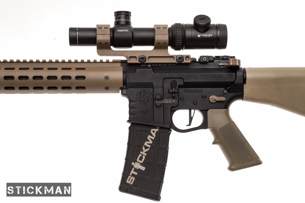 The upper and lower receiver are billet, and from Cross Machine and Tool. Jeff Cross makes great stuff, and the barrel extension went into the upper receiver with zero slop, and some positive pressure. I bring this up because years back, a wannabe gun writer complained that the receivers were too tight. The guy preferred barrel extensions to drop in easy and have some play. I still shake my head when I think how clueless that person was (is). In this case, the upper and lower have a tight, close fit. No need to get out a mallet, but no extra play either. Simply perfect.