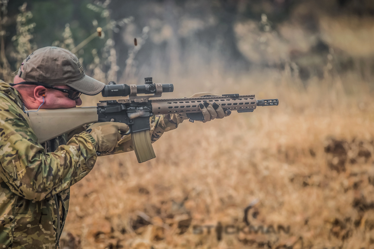 Why an A1 rifle stock instead of an adjustable carbine stock? It really works in this application, and the rifle spring and buffer combo makes the shooting experience super smooth. I think we all too often think of rifle stocks as only for longer barrels and “AWB” states. The A1 stock length works well while wearing a tshirt or heavy clothing.