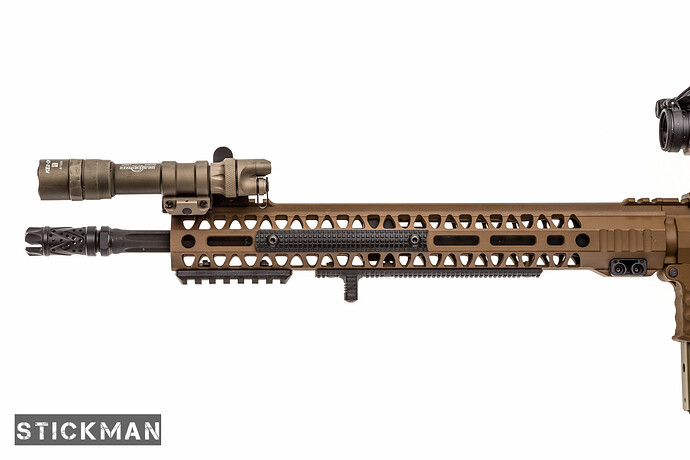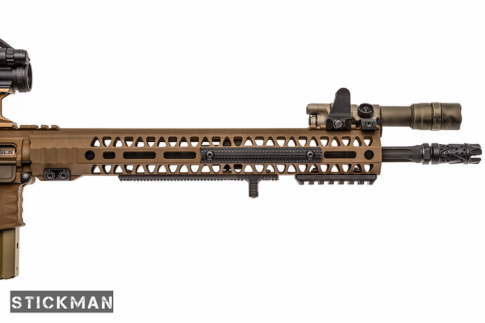 The rail guards and thumb stop/ finger mount are all from VZ Grips and are made of G10. G10 machines exceedingly well, and is quite good at keeping a layer of insulation between heat and your hands. The VZ Grip rail covers come in a variety of colors and textures. They install onto MLOK slots just like any other MLOK attachment. I like these because in addition to the above, they are also something unique, and I appreciate good looks on a weapon almost as much as on the fairer sex. In the front slots on the underneath, I have a 1913 attachment so I can chuck a bipod on this if needed. It doesn’t usually have one, but options are a good thing.