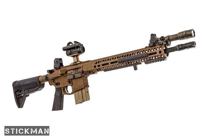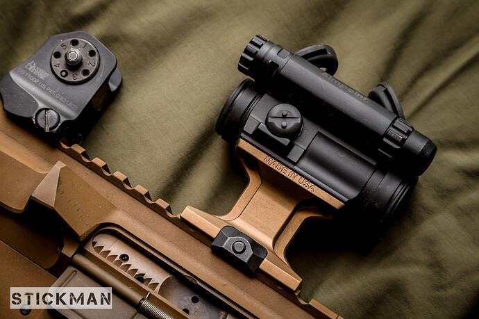Last up we hit the optic and optic mount. The choice of optic for this weapon is the Aimpoint Comp M5. I’m not even sure if there is a point in explaining why Aimpoint is the choice. I don’t want to fall slack this far into this article, so I’ll throw out a few reasons. First and foremost, durability. I can think of nothing that is even a close second to the durability of an Aimpoint. It isn’t a matter of being chosen by the military, because we have all seen the military make miserable choices. It is a matter of knowing the products and using them on a regular (if not daily) basis. A quick story here, I once used a different optic on my duty weapon and at the end of shift a call went out of a kidnapping in progress where a recently released felon had abducted his ex girlfriend and drug her into an apartment. I pulled into the back of the complex and was grabbing my carbine while heading into shadows for concealment when other units called out the guy was coming out the back. My optic was dead, no matter how many times I punched those buttons it wasn’t going to work despite the fresh batteries in it. Dissimilar lighting conditions meant I was using iron sights at night across a brightly lit parking lot, trying to view a dark background of a dark man in dark clothes. There were a few lessons learned, one was about optic durability, and another was about battery life. With an Aimpoint there is no need to turn it on and off, just leave it on, and if its a duty weapon swap the battery once a year (even though battery life is something like 5 years).
