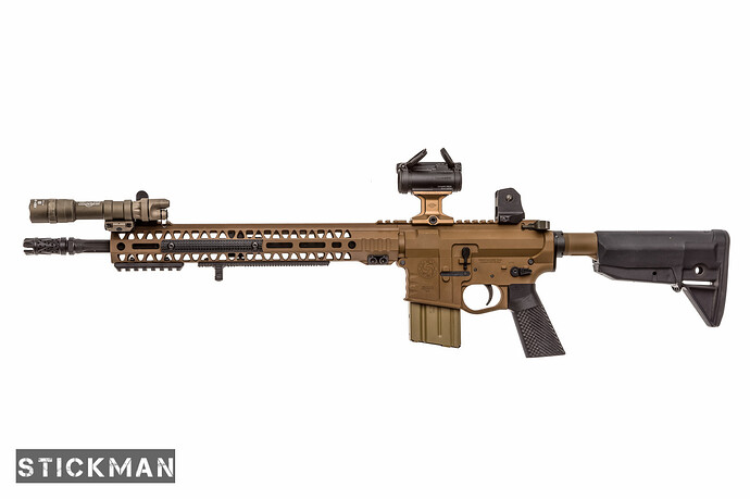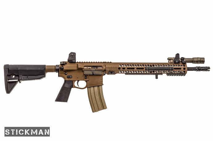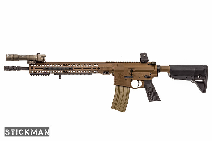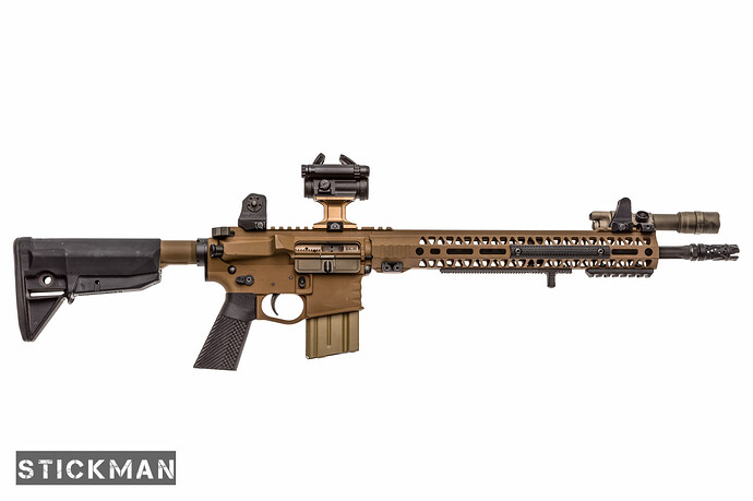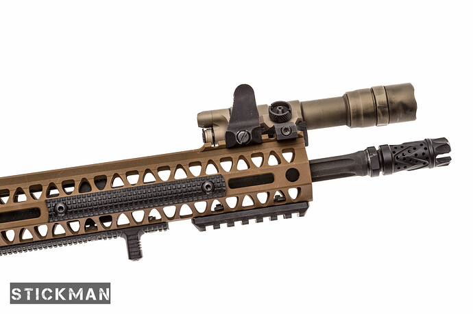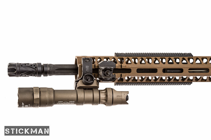Up top we see a few thing a little more prominently. First off is the flash suppressing compensator from … you guessed it, Cross Machine Tool. This muzzle device does more than just scream noise, it adjusts the feel of the firing weapon, as well as kills flash to a larger degree than straight up comps and brakes. Yes, it is a Jack of All Trades device, but its pretty slick and I like it. I’ve had a standard A2 muzzle device on this weapon previously, and this makes it a bit smoother overall. The flash light mount is from Gear Sector, and I’'ll once again lament, wail, and gnash my teeth that Jason Trusty closed up shop on Gear Sector. His designs and implementation were outstanding. This mount locks in place off the 1913 sections on the top rail, and cradle the light at the 1030/ 1100 position. This makes it perfect for activating the push button light. The dual fuel model Surefire is long enough that it forward mounts in a manner to prevent barrel shadowing. I think everyone already knows that if you are concerned about your light, put a piece of clear tape over the lens when you are shooting and pull the tape off when you clean the gun. Or if you are lazy, just grumble and clean the lens later like I do when I forget.