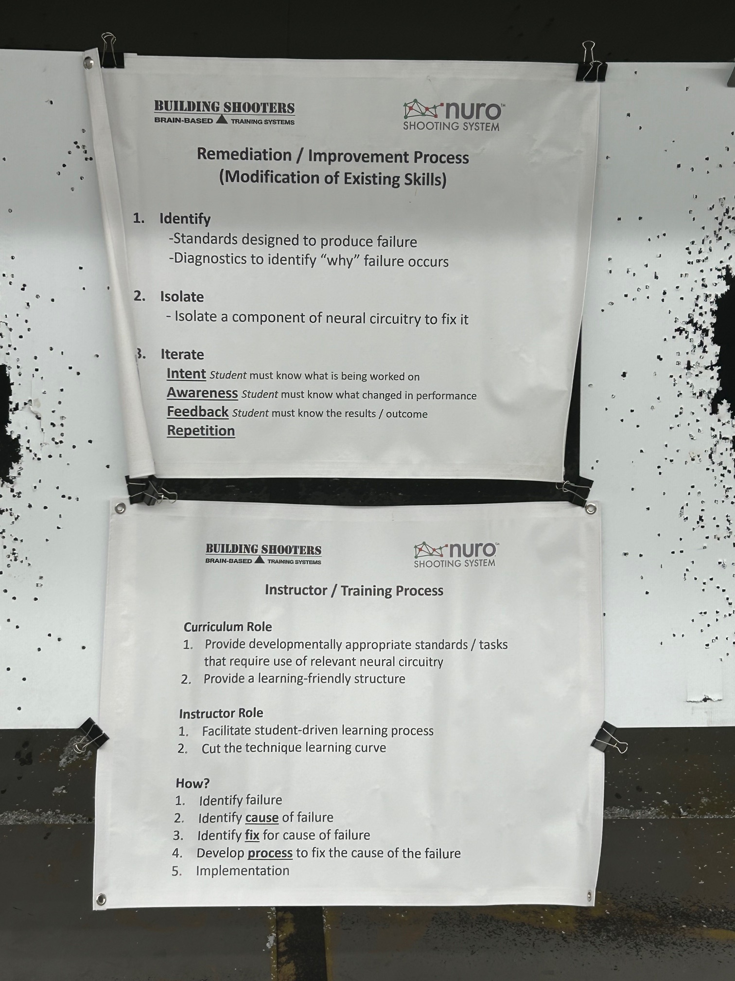 Unfortunately we only spent about an hour actually working with another shooter in the class as a coach. There was some interesting outlines presented for structuring a program (built around a 6 month police academy so not very applicable to us). A lot of time was eaten up repeating information from the first two days for people who only came to the second class and then shooting drills with the Neuro in groups of three, which made for a lot of down time and wasted range space.