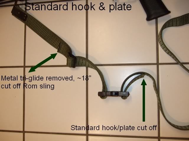 Sling two: remove metal tri-glide, and cut the webbing by the metal plate which holds D-ring.