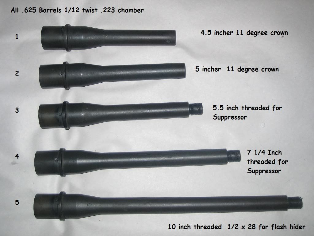 Selling off some more of my stuff I dont need. Perfect for .22 build or a 223 pistol build. I used #3 & #4 with my suppressor and they worked perfecty, #5 is threaded but I wouldnt recommend using a can on it.