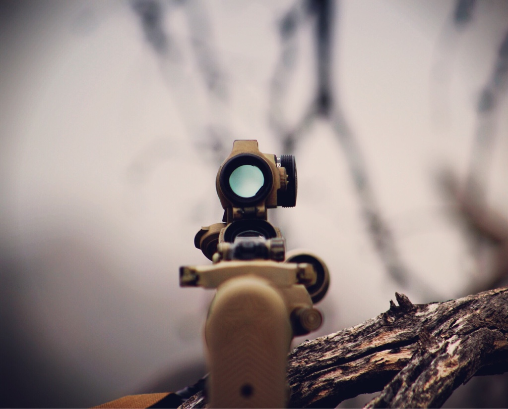 The the focus of the photo, being able to capture the firearm while still getting a detailed image of the branch it’s resting on. I wasn’t using a tripod, so it made it difficult to hold this while trying to get a clean shot of the dot, it proved too hard. I do wish I had moved that front lens cap out of the way to maintain a feel of symmetry to the firearm . I also like the feel of a foggyness of the photo, this was done only using the manual focus of the lens on a clear blue day. The filter enhanced it but it was there before I edited the photo.