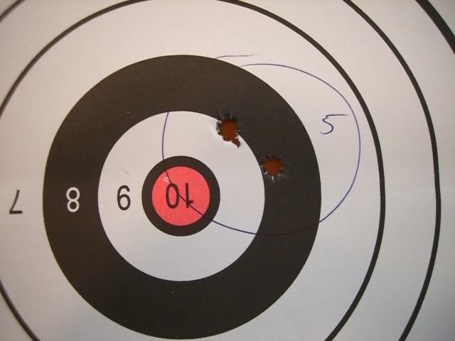 group 5 was another 3 shot, 2 hole deal. I hung the target upside down for the last two groups because I did not want to shoot up at an angle towards the ceiling in the range. I was sitting at a bench and the target hangers are more the height for standing.