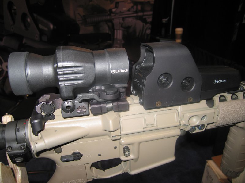 I have a 1.1-4X variable optic on my AR and have seen an Eotech 4X at a shop, I have to say I liked it. The Aimpoint or Eotech with the magnifier really seems to be the best of all worlds for CQB out to mid range. Although I don’t think I’d run the tip off mount on the magnifier.