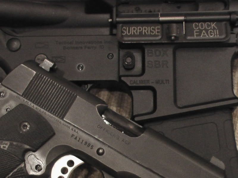and a few pics all together.it’s an lmt 10.5 upper on a tactical innovations bdx sbr factory registered lower.lmt full auto bcg.g&r lpk with an ssa trigger.i’m building a kitty kat upper for it also,just because.![]()
