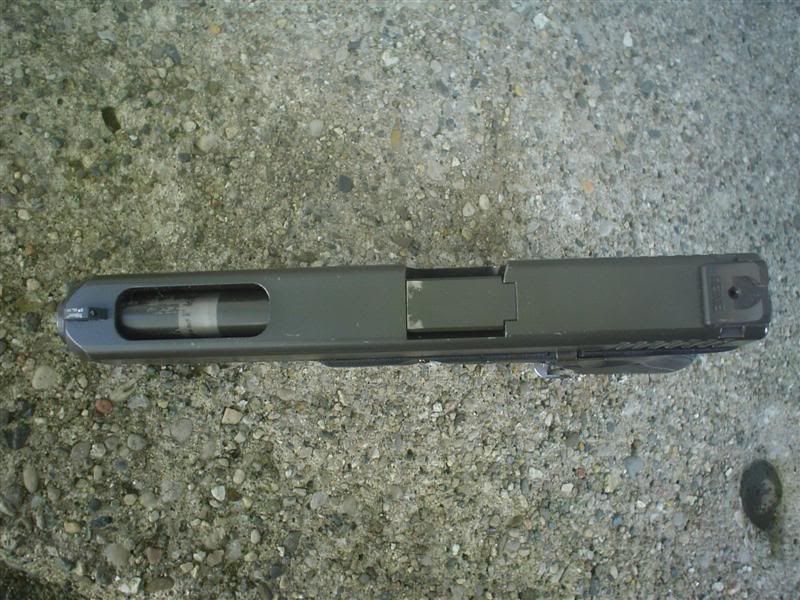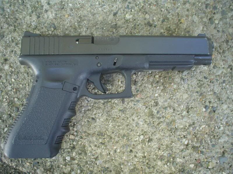 Glock 35 with Heinie Slant Pro sights(green tritium front). Slide has been Duracoated a dark grey/green. Finish does have some wear on slide and bbl. Extended Mag release was replaced with aluminum mag release. Comes with 2 fullcap mags.