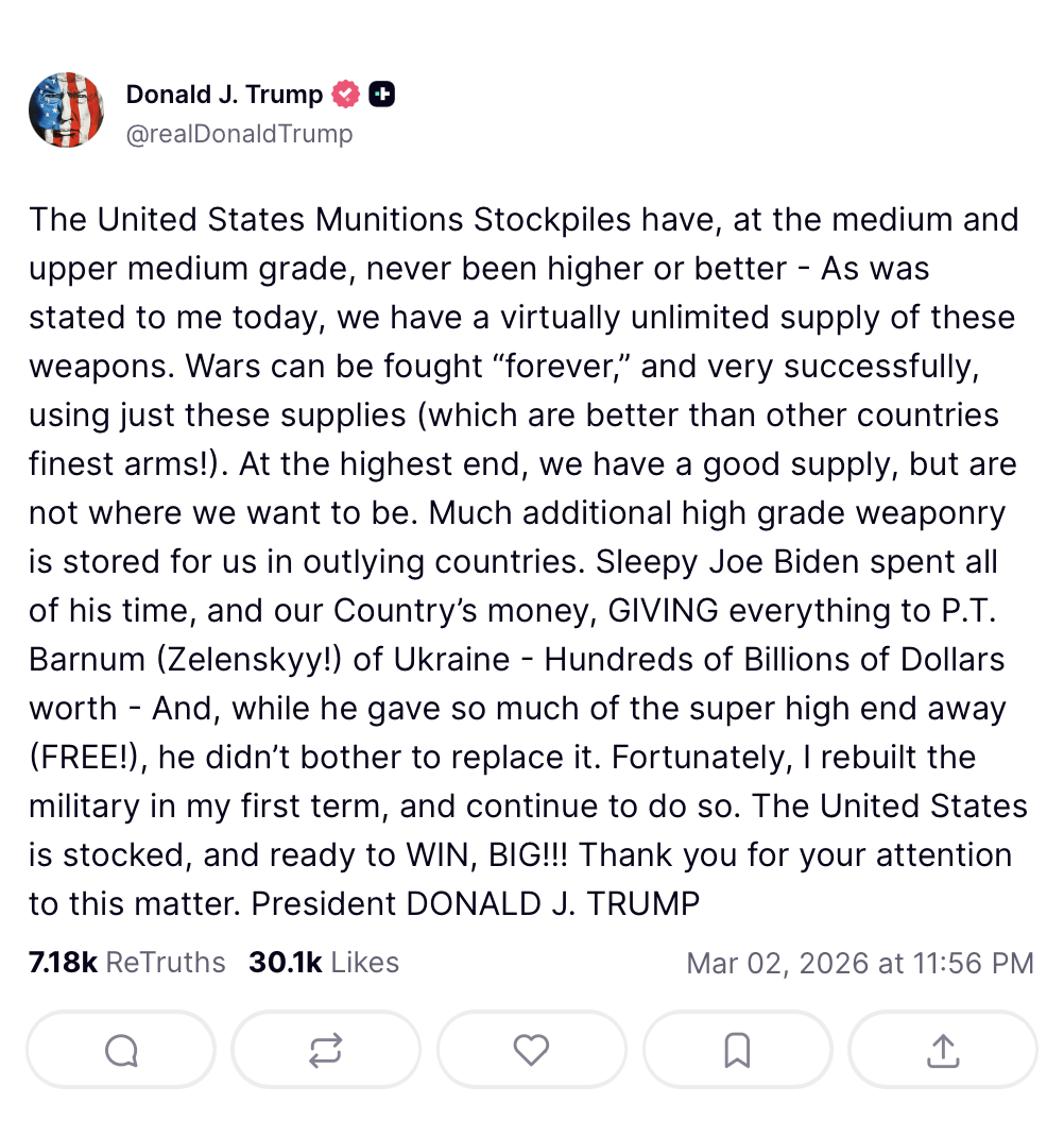 Remember when Trump “nationalized”, or whatever it was called, one industry during COVID to make them manufacture those little ventilators they thought would be needed? Can’t he do something similar with regards to munitions? Hell, some laid-off auto workers might be happy to have their former factory re-opened for business.