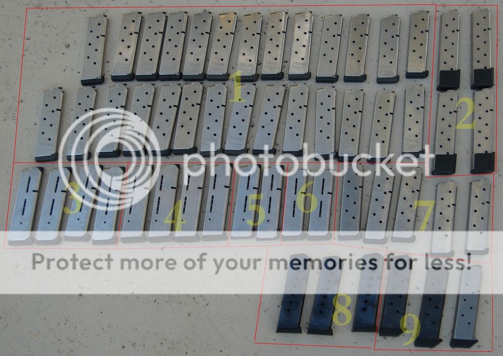 All prices EXCLUDE shipping. Bulk/quantity discounts may be negotiated. No cracks or other damage in any of these magazines, and all worked without failure the last time I used them 2+ years ago. They have sat, unloaded, in an indoor closet since that time. Some have wear marks, some have a slight tarnish (no rust!) but all appear to be functional. Some also have floorplates with white markings or colored with grey Norrells.