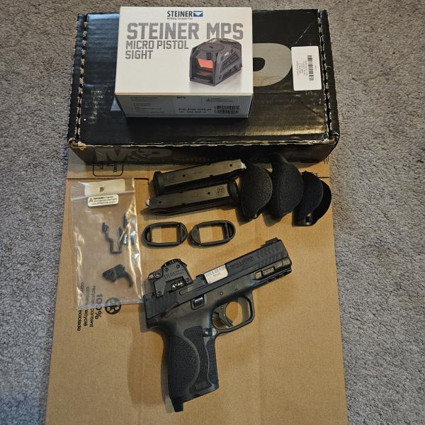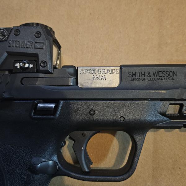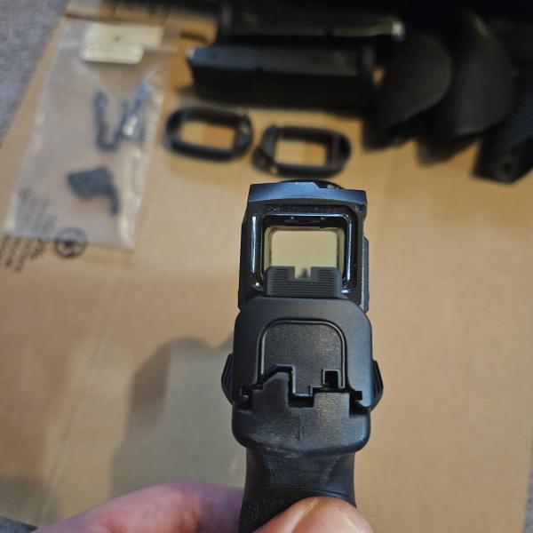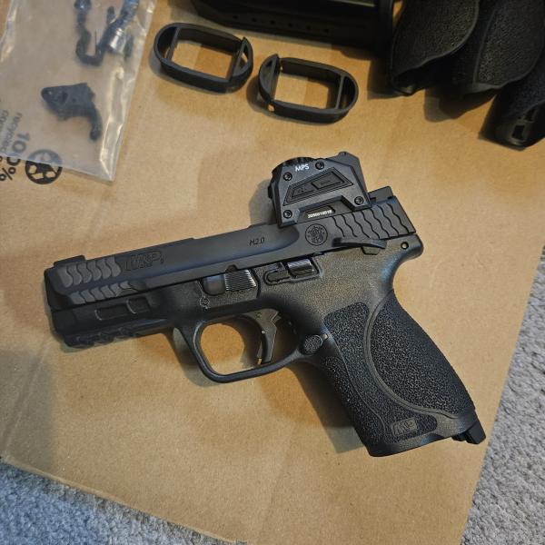 This was another spare in the safe. Easily under 500 rounds. M&P 2.0 4" Compact CORE. Thumb safeties, OEM extended slide releases, Apex duty/carry action enhancement kit, Apex gunsmith fit barrel. Core slide was sent to Floyds Custom Shop and milled from the Core to a direct MPS and refinished in black nitrite. This could also be sent back and the front of the cut extended for a direct cut Acro. Plain black standard height Dawson Precision sights give a nice low cowitness. Comes with 2 15 round mags, all stock trigger components, 4 backstraps and 2 of the sleeves for use on 17 round mags. I’ve fit several of these Apex barrels and each one will routinely hold the 10 ring of a B8 at 25 yards.