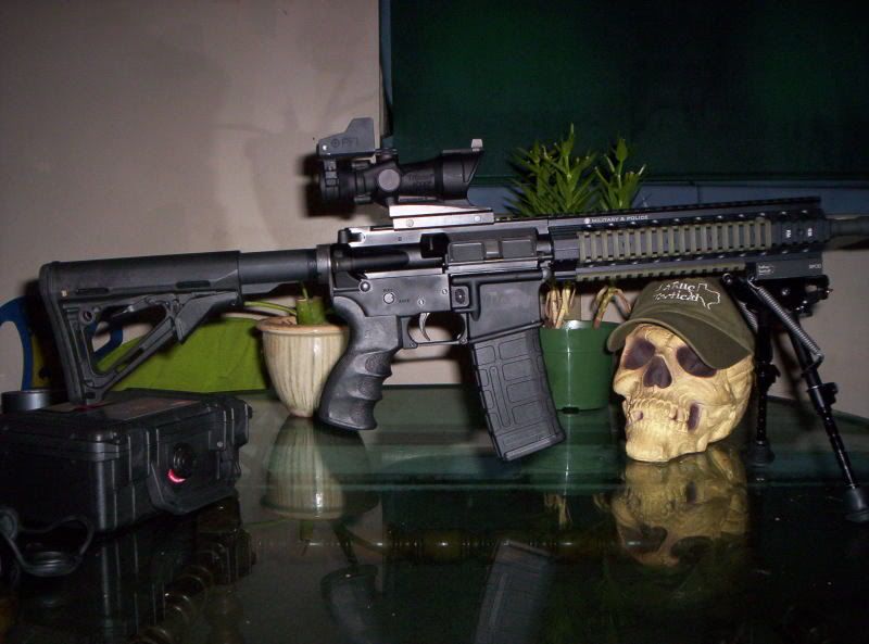 Just a M&P15T with Magpul CTR stock, Pmag, low-profile ladder rail protectors, JP 4lb. tactical springs, LMT H buffer, LaRue 4XDOS ACOG mount (not shown, it’s off right now getting re-finished), ACOG 4x32 TA01NSN w/ Pride Fowler Special Ops Mini-Red dot w/ Pride Fowler ACOG mount, and LaRue bipod adpater… and yeah, the skull is on my kitchen table for my favorite holiday of the year