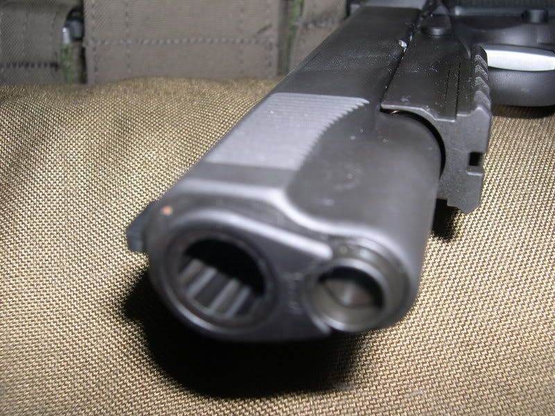 Nonetheless, outside of a little zinger on the Heinie rear sight, there is ZERO visible wear. The pistol ate a little less than 12 cases of ammo without a hiccup. The barrel is Melonized inside as well.