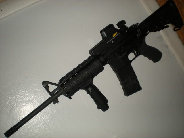 DPMS lower, Ergo Pistol grip, CAA rear stock, Single Point Sling attachment. UTG foregrip and quadrail with rubber covers, LMT rear BUIS, EOTECH