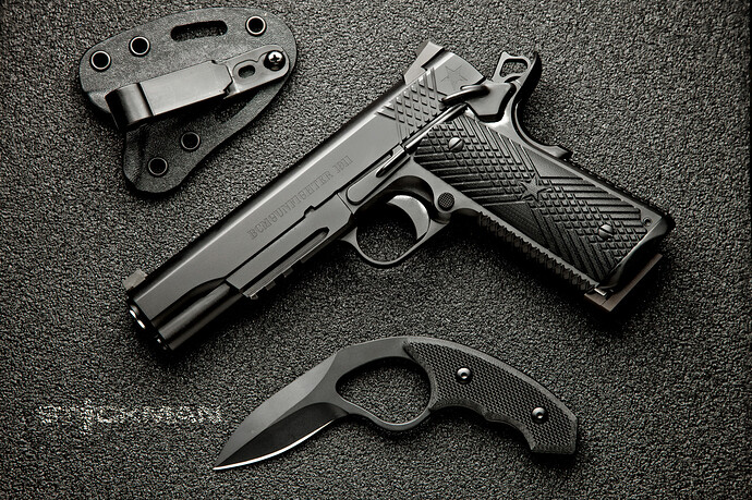 Here is the BCM GUNFIGHTER 1911. It is a project from Paul at BCM, and those crazy kids at Wilson Combat. Paul took input from a few different sources, and spec’d out what was felt to be needed in a 1911. The knife is “The Colonel”, and is from BCM as well. It made sense to me that these belonged in a picture together.