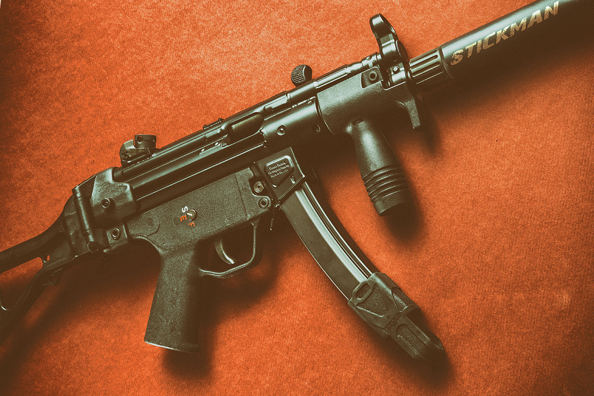 MP5K(ish) model built up by Dakota Tactical using a RS receiver. A full size receiver with the K front end allows for use of any standard stock, assuming of course that you have the stamp from the man, or the proper licensing.