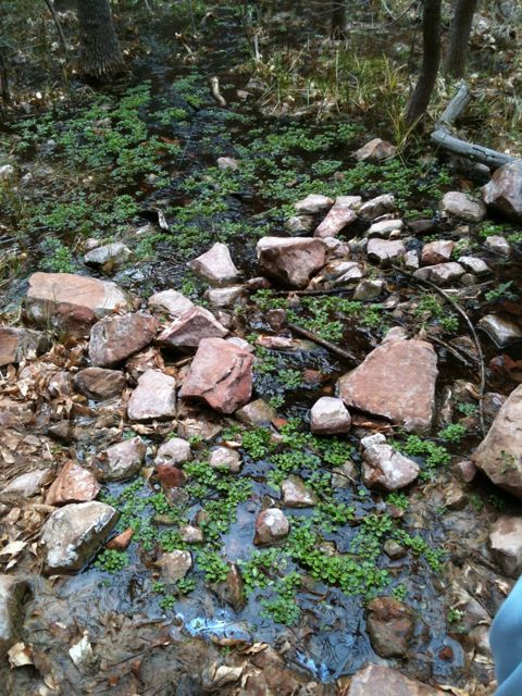 Along the way we saw a spring with water coming out and flowing into the river. It was not obviously water running down the walls of the canyon and then going into the river. This water was on one side of the trail and the other (up canyon side) was not wet at all. Even in Jan (and there was ice and snow remnants on the ground) you get green growing aquatic plants in a desert.