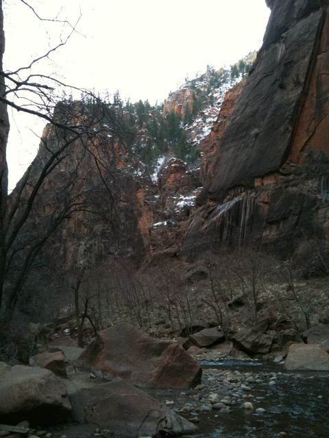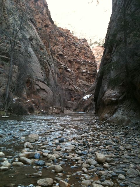 We drove up to the end of the road that goes along the Virgin river (not the through road). We parked and walked up the trail – a mile – along the river to where it starts to get really narrow.