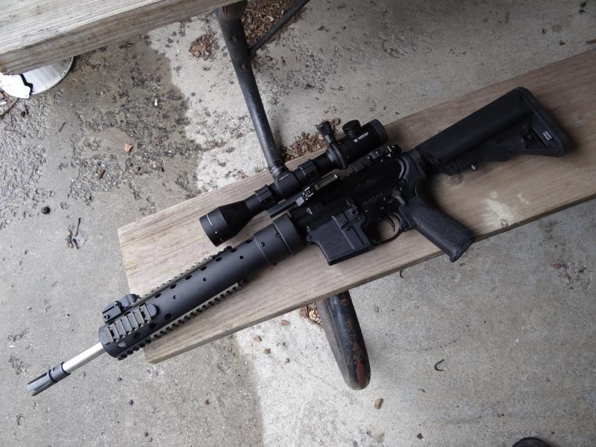 It is mounted on a DDM4V7 lower with a Giessele SSA-E trigger and I have a VCOG for the optic. It all comes together to make a rugged, reliable rifle that is great for many tasks. The whole ensemble meets my use criteria perfectly.