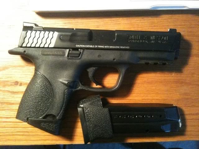 First item is a full sized M&P9 with a cutdown grip that accepts compact magazines. The backstrap is the medium backstrap that has been semi-perminantly attached to the firearm, but I believe I can take it off and change the backstrap out with a small or large backstrap with the buyers preference. This pistol comes with two extra full sized magazines and one x-grip magazine sleeve. I have the compact magazine baseplate on the 12 round magazine right now, but will include the finger rest baseplate at no additional cost. The pistol also includes factory S&W green/green night sights and an APEX DCAEK trigger installed.