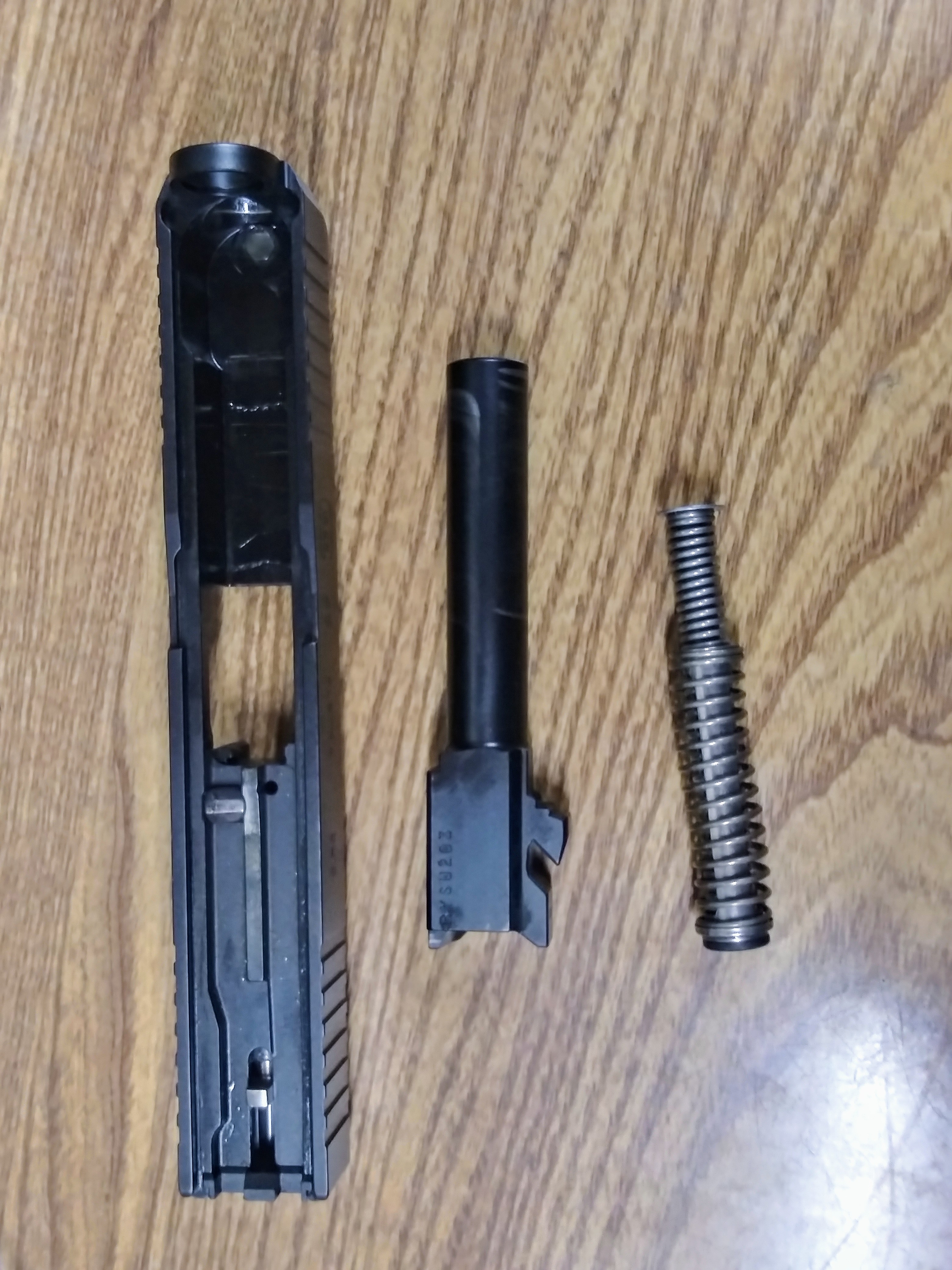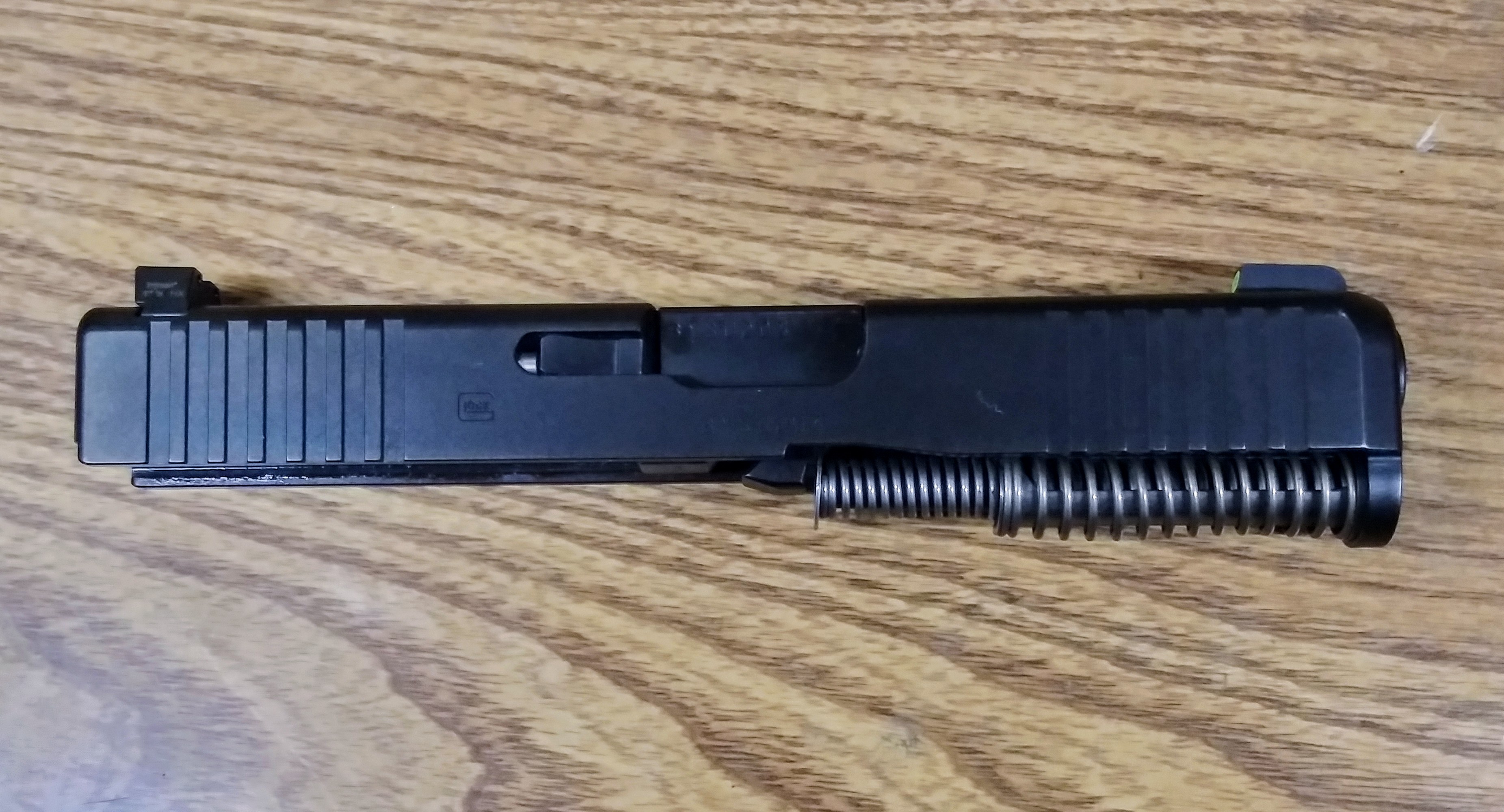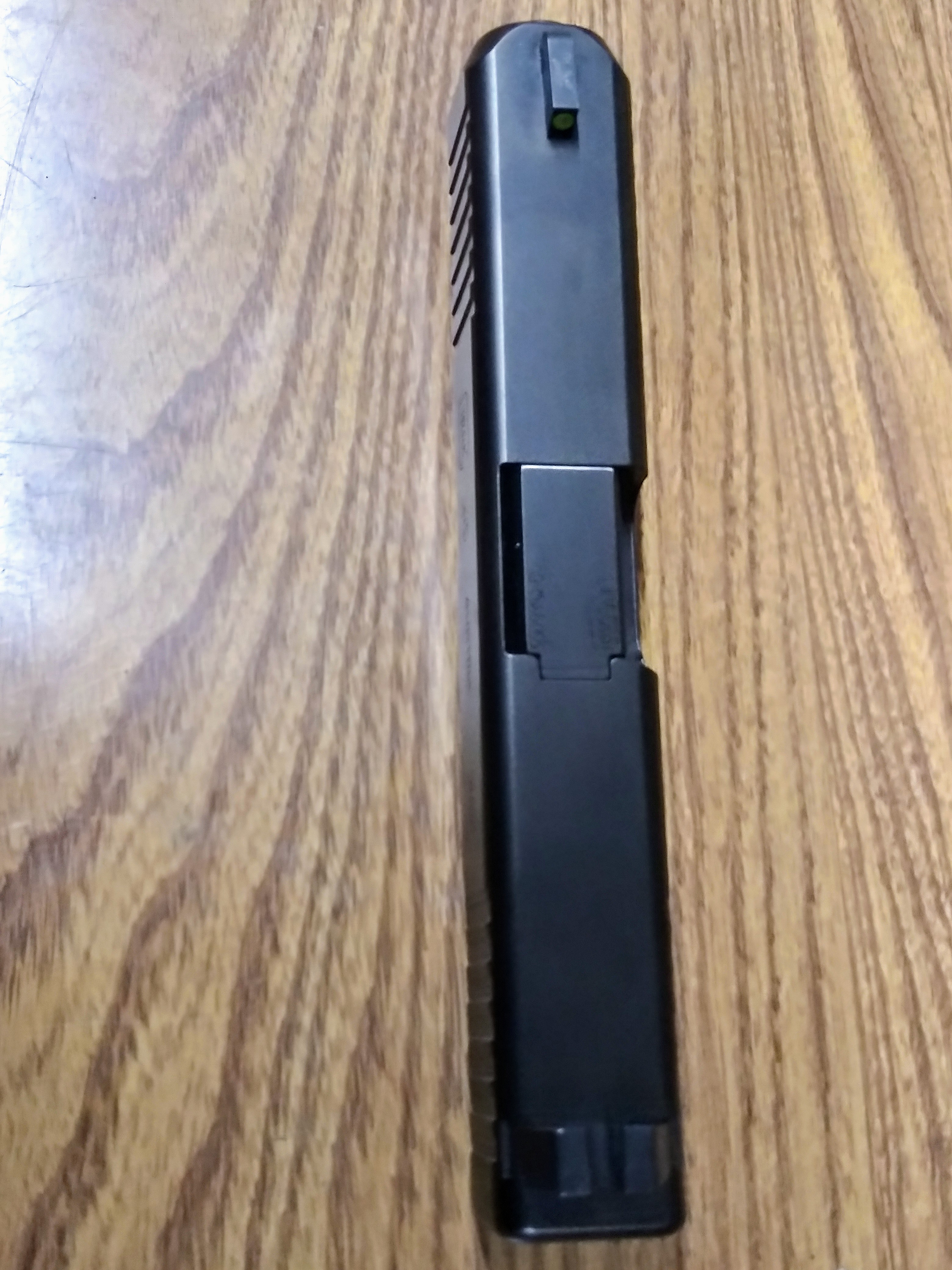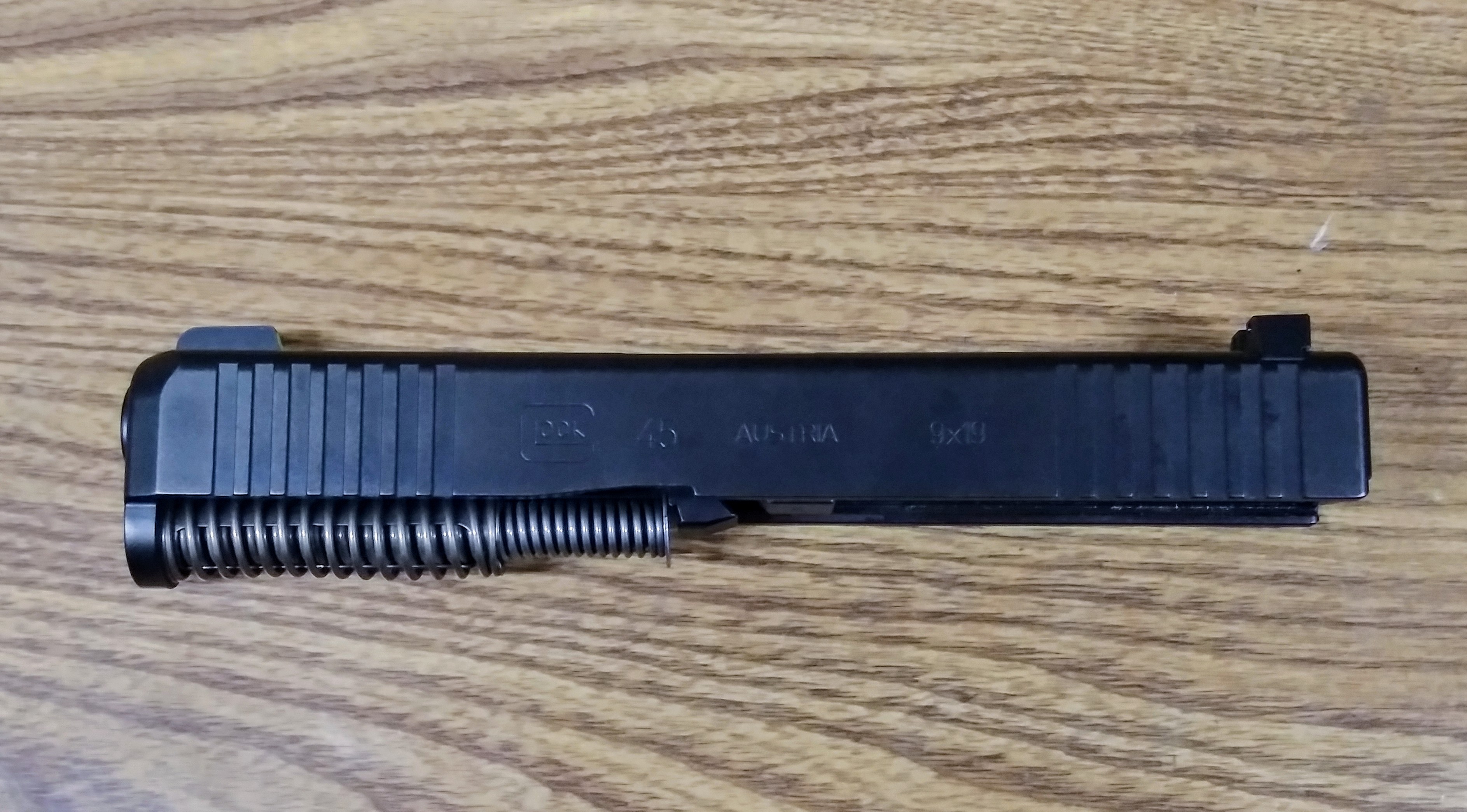 For sale is a used Glock model 45 slide. This is a complete slide with barrel and RSA, all OEM. It has Trijicon HD sights with tritium front with yellow outline and black tritium rear. The upper is in great condition and has had about 500 rounds through it.