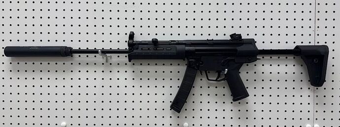 I picked up an AP5-L from Palmetto State Armory for $850. It’s a rifle with a 16" barrel and Magpul stock set. It came with a fake suppressor that covers the barrel when installed. The muzzle is threaded and has trilugs. Here it is with a B&T suppressor installed.