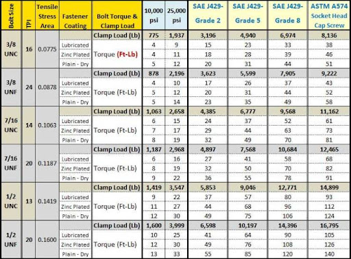 One other thing that I find is lost on people is that generally speaking you don’t want to tighten your bolts to the point of impending yield (just below where it begins to permanently deform or stretch). The reason is this - the bolt is preloaded (stretched) when installed. Then in service it may see additional loading that would put it into the yield range. Think of how the fastener is loaded under recoil or gas pressure and you’ll see what I mean.