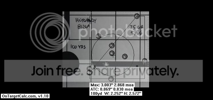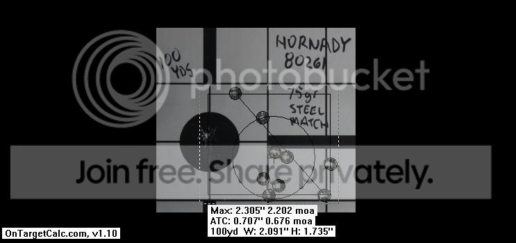 I don’t have ballistic analyzing software that some contributors like Molon have, and I don’t really know how you measure a group and compute the true m.o.a., but I measured the spread between the two farthest hits. Maybe someone else can chime in if they know how to convert this to an m.o.a. value. I get 2 3/8" spread by my crude measure: