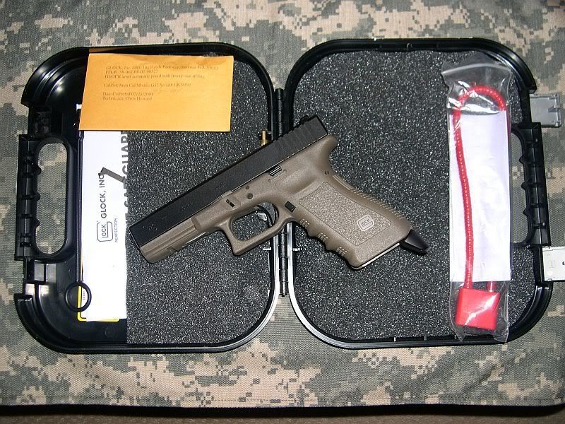 I have for sale a Glock G17 with OD frame. It has exactly 149 rds through it. ( I dropped one) It has a fresh set of Trijicon night sights, 3 dot, in green. Also has a CQD Tactical Grip Extention in the backstrap. It is held in place by a set screw and is easily removable. Finally, it has a 3.5# connector (Glock) but has the original 5# as well if you prefer it.