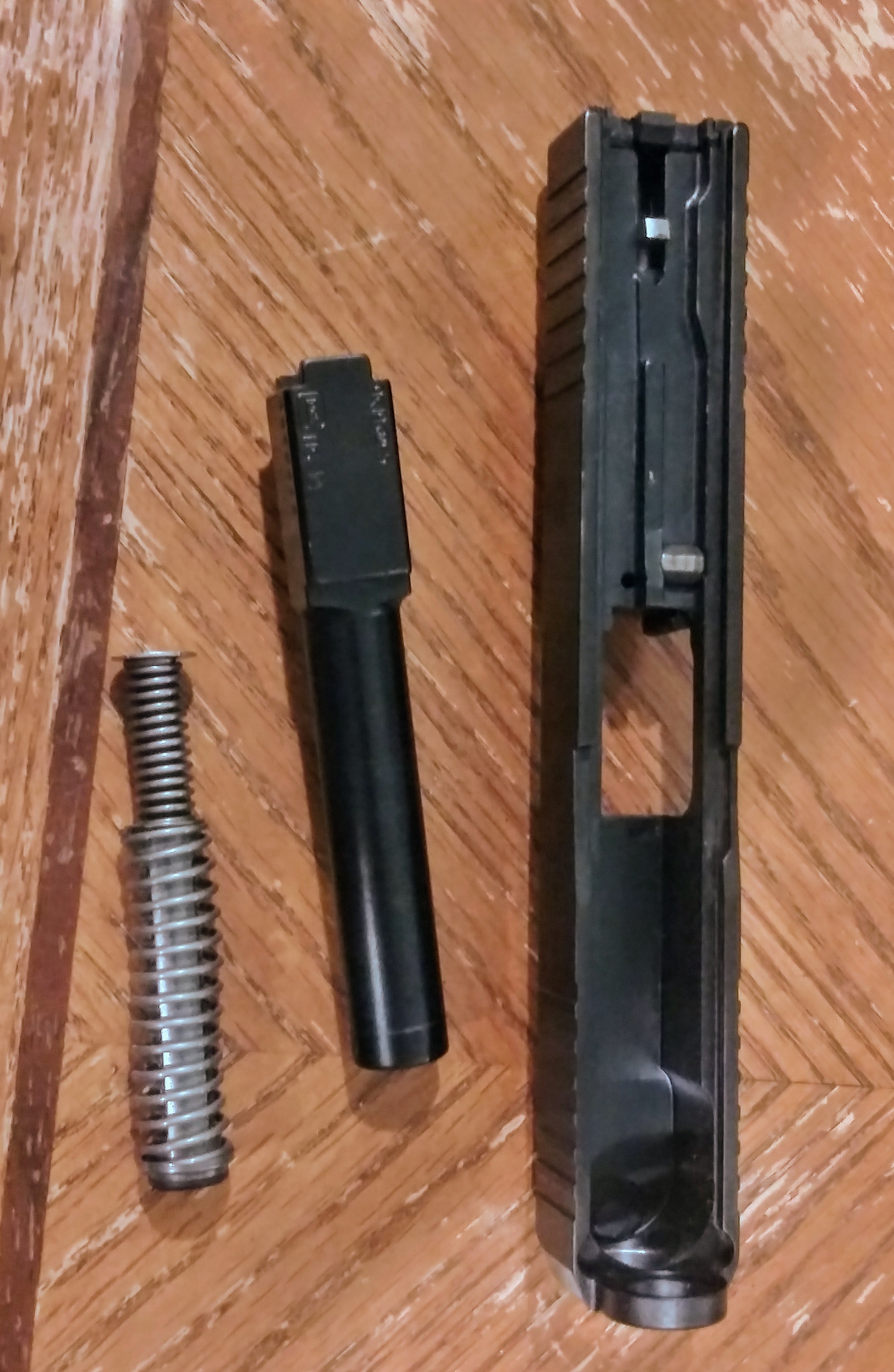 For sale is a lightly used Glock model 45 9mm slide. The slide is complete with OEM internals, barrel, and recoil spring. It has the stock glock sights on it.
