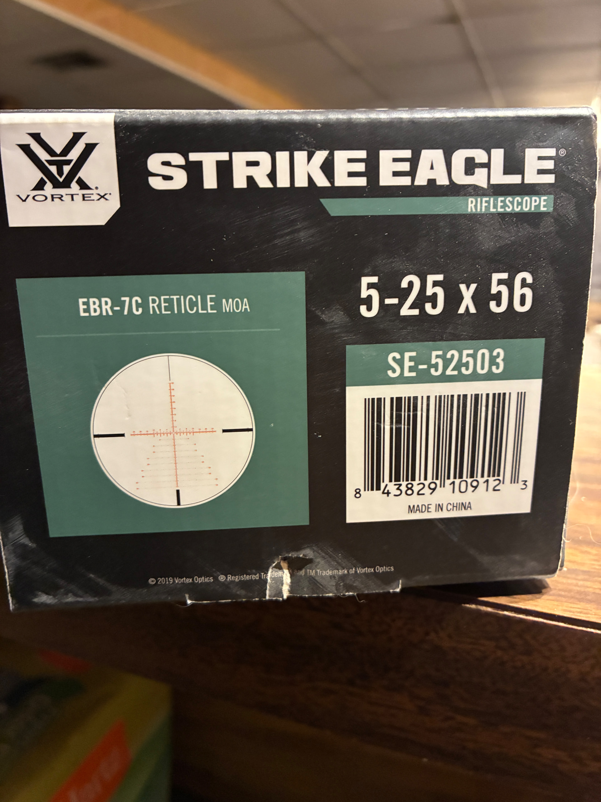 Vortex Strike Eagle 5-25x56 FFP MOA. Been used, turret caps are the only thing with real signs of wear