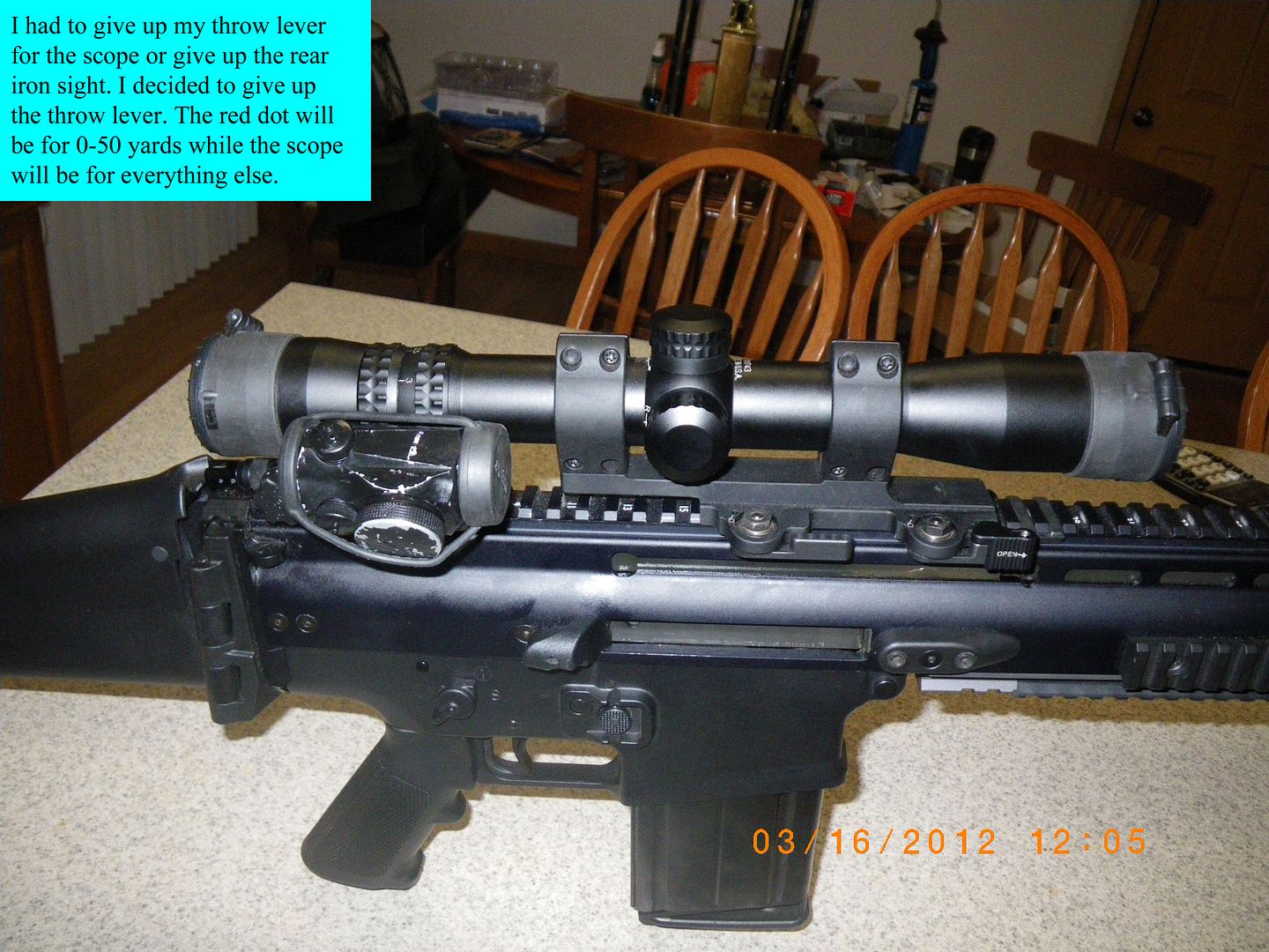 The pic shows the Aimpoint but I moved that one to the SCAR and put a Primary arms unit back on this rifle.
