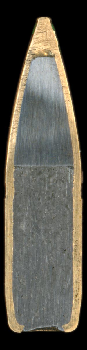 The cross section shows the jacket and the lead core along with the steel "penetrator" of the M855.