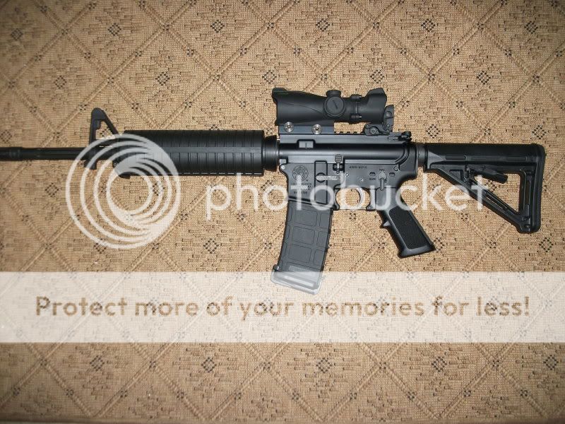 Give me the good the bad and the ugly. This is my first build so to say. I started with a S&W lower and installed a MOE stock on it. Also not pictured is a MIAD grip and trigger guard. The upper is a DSA mid length with a fluted barrel. I have no clue who made the bolt and carrier. The hand guards are from Cav Arms and the Buis is a Magpul. The optic is a Bushnell 1x32. Which is a surprisingly good optic by the way. Anyway here she is: