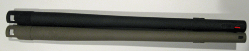 Side by side. It's hard to see, but the lighter barrel has more curve to it, while the Heavy barrel is straighter. The tan barrel is 2 lbs, the heavey barrel is 2 lbs 6 oz.