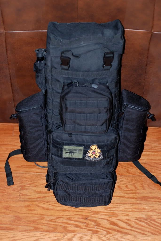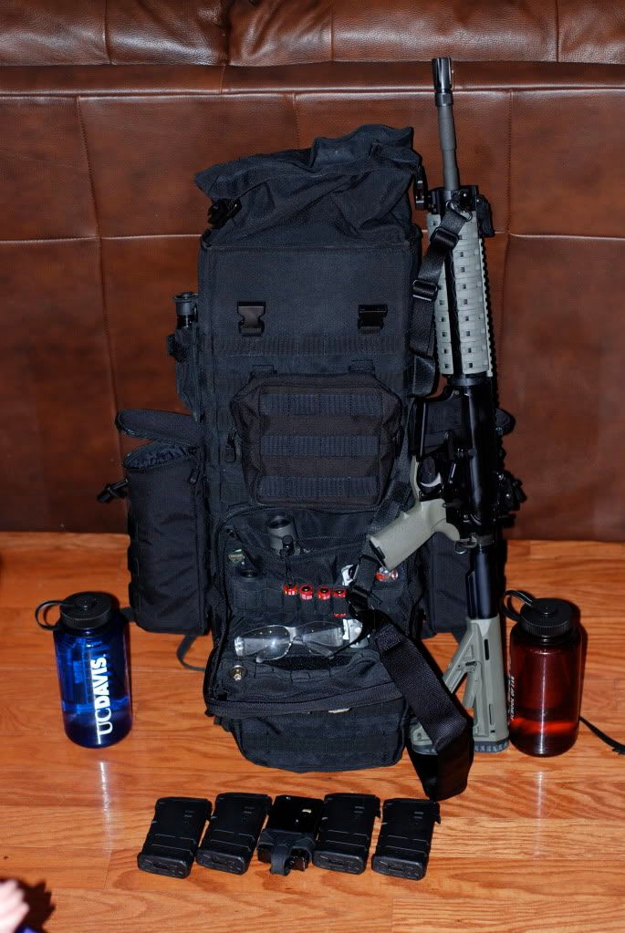 Main pack... holds a Rifle duh. Its a Smith and wesson lower, with the whole magpul treatment except the sights they are ARMS its running a bushmaster 14.5 barrel with a YHM free float tube its simple and weighs NOTHING.