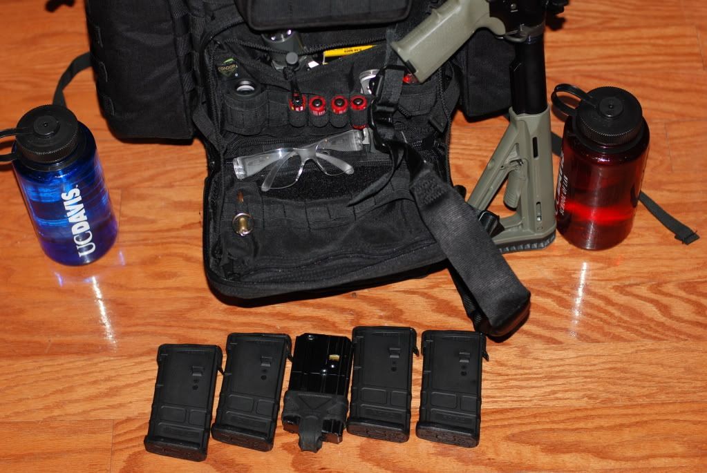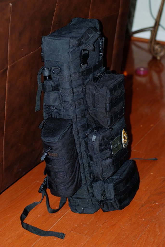 Anyhow it started is life as a Condor Mini drag bag, then I added their T&T pouch, flashlight pouch, a couple of utility pouches and 2 camel back water carriers. The plan was to build it to hold my 14.5 and go undetected, as if it was just another backpack. Last month my wife and I went to San Francisco to watch a show, as a test I emptied it out of all of its evil stuff, and took it into the Hotel when we checked in. I walked all over the place and never once got even an odd look. It was like I was just wearing an odd looking backpack.