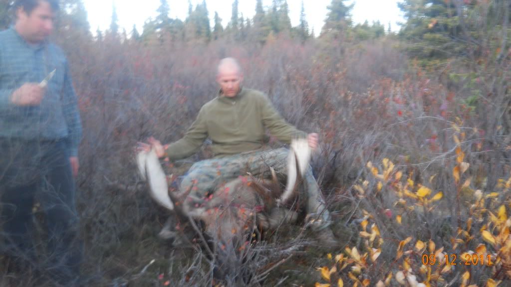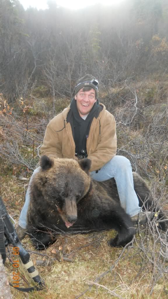 Griz is about 6 feet nose to tail, moose is 48 inches wide. Will get about 400lbs of meat off of the moose.